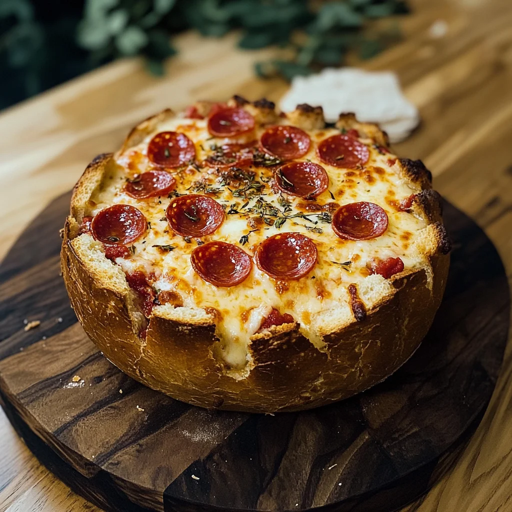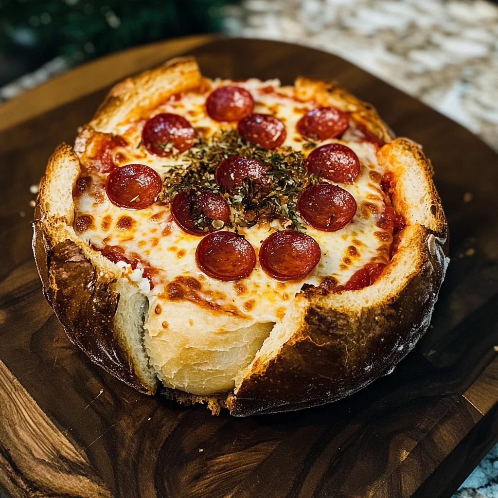 - Pour marinara into the hollowed bread bowl, layer with the cheese mixture, remaining mozzarella, parmesan, and turkey pepperoni.